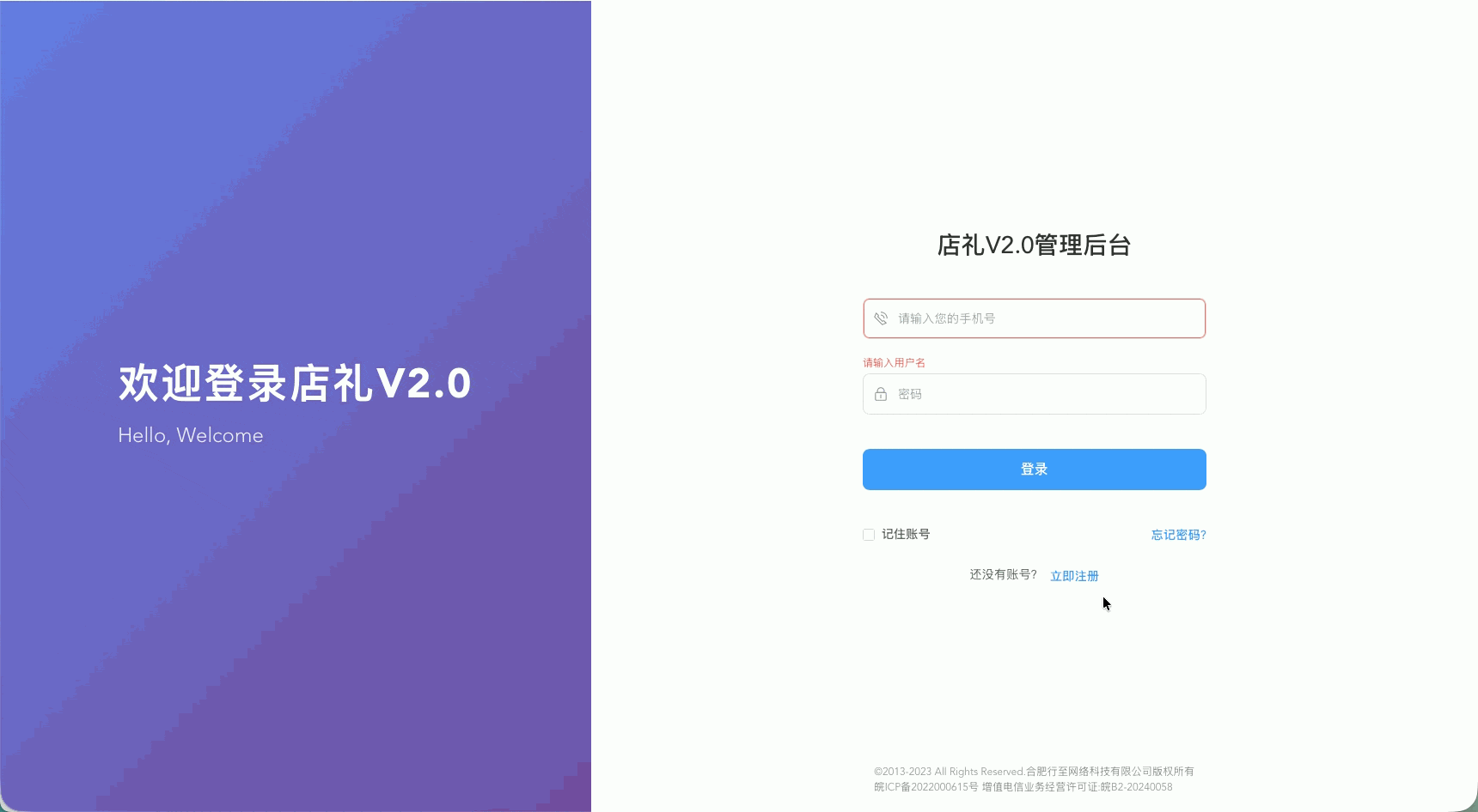 打开网页后,点击立即注册,输入老板/管理员手机号,设置密码,获取验证码即可完成注册。